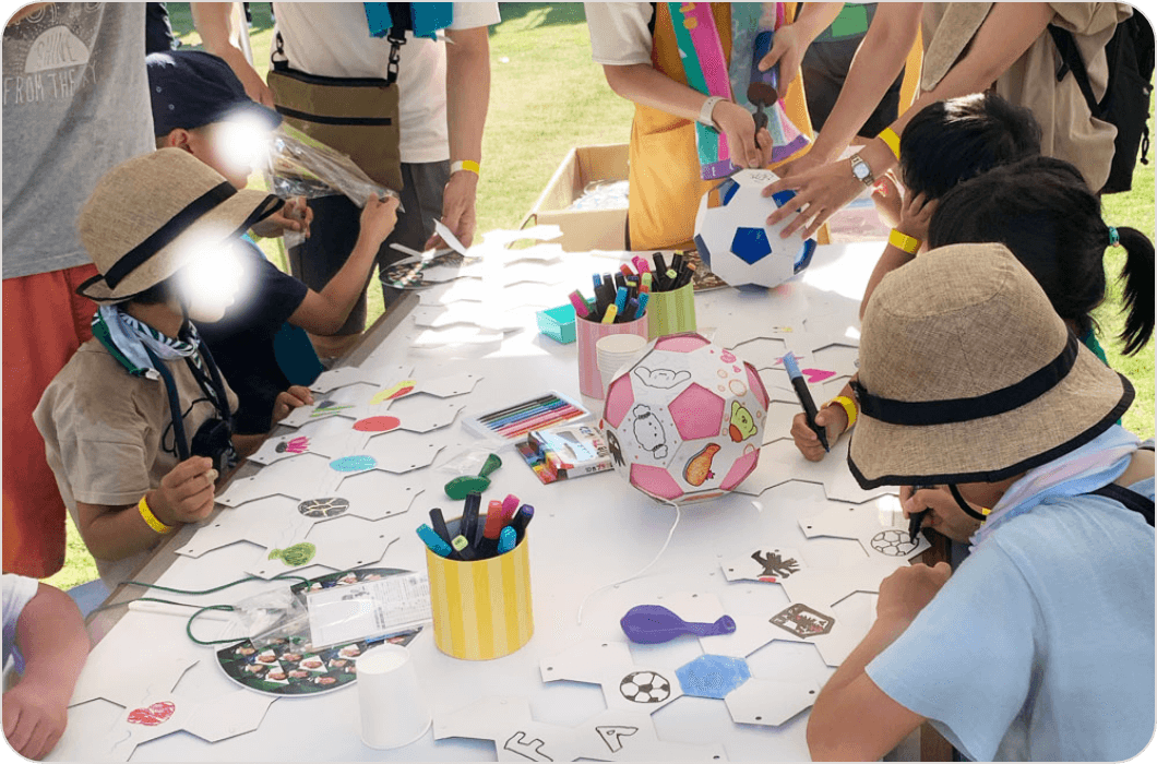 FC岐阜のイベント「 わくわくワークショップ」で、オリジナルサッカーボールが無料で作れる体験ブースを毎年出展しています。